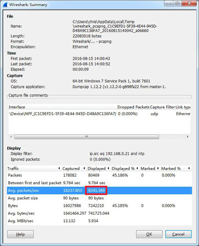 点击菜单“Statistics/Summary”,得到每秒NTP响应数量