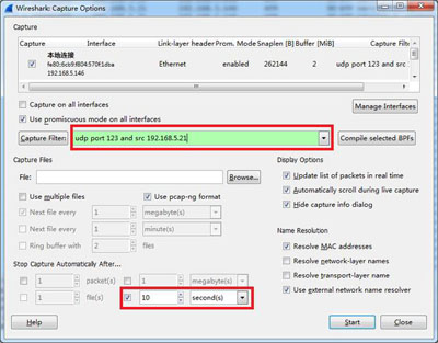 开启wireshark,设置捕获参数(“Capture Options”),选中“本地连接”,并设置过滤器和停止时间,并点击“Start”,如下图所示: