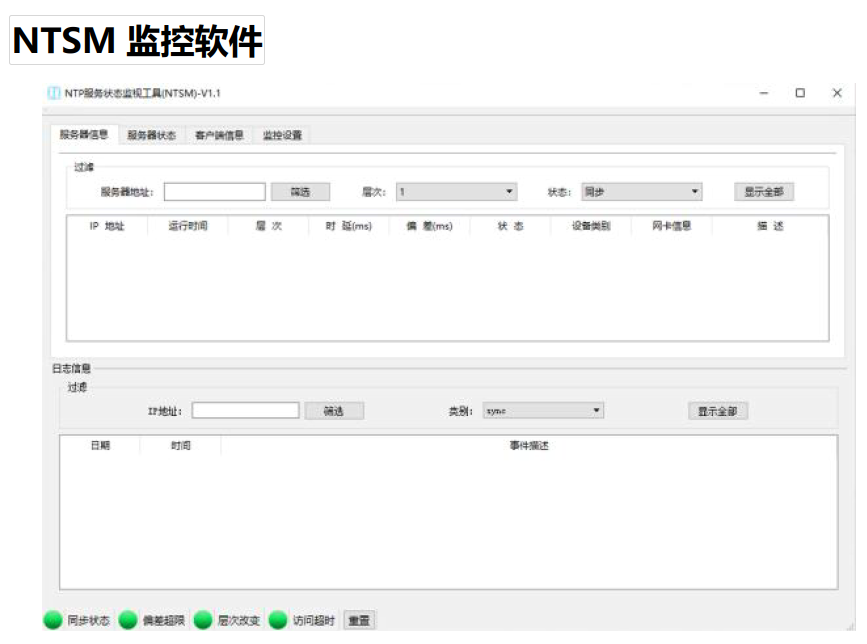◆用于对设备中NTP服务的详细监控; ◆可监视服务器自身的状态信息,包括同步状态、时间偏差、层次信息等; ◆可监视卫星参考源信息,包括锁定状态、定位信息等; ◆可监视NTP客户端访问情况和时间偏差; ◆支持时间偏差门限告警、失锁告警和状态切换告警; ◆支持SNMP、SYSLOG、EMAIL等告警方式。