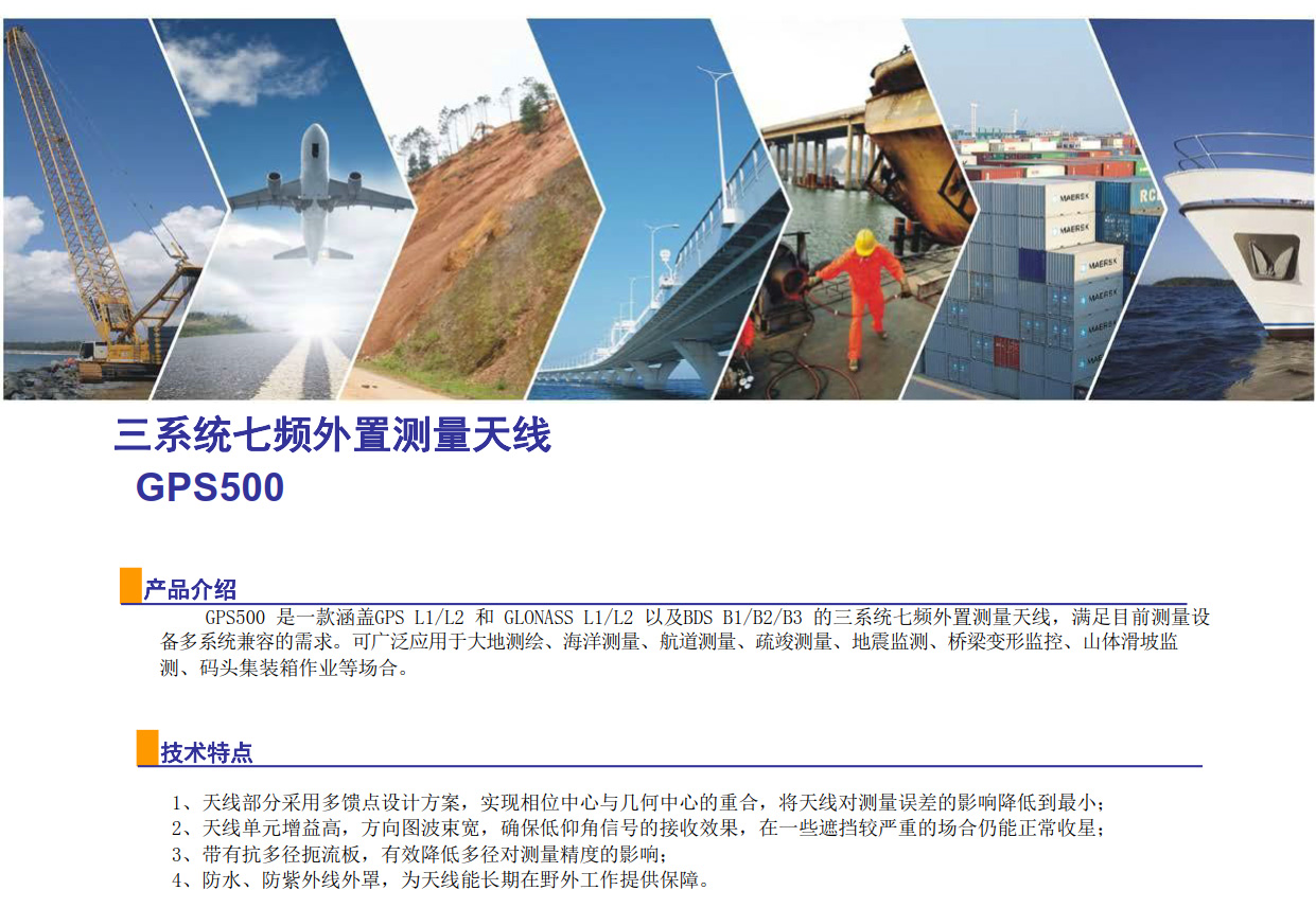 GPS500 是一款涵盖GPS L1/L2 和 GLONASS L1/L2 以及BDS B1/B2/B3 的三系统七频外置测量天线,满足目前测量设备多系统兼容的需求。可广泛应用于大地测绘、海洋测量、航道测量、疏竣测量、地震监测、桥梁变形监控、山体滑坡监测、码头集装箱作业等场合。...