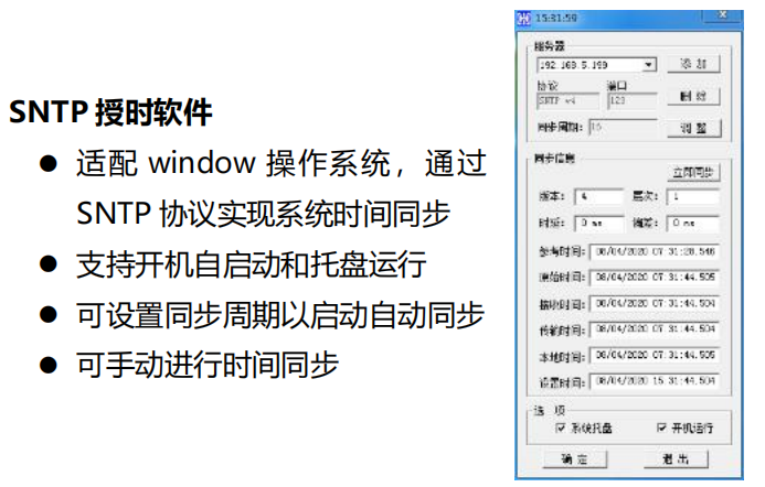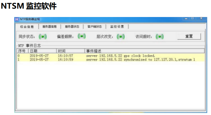 -技术指标- 网络和服务 ●NTP v1/2/3/4(单播/多播/广播/Autokey),SNTP; ●Telnet,SSH,FTP; ●SNMP v1/2/2c/3,MIB II (RFC1213); ●IPv4、IPv6、IPv4/IPv6 Hybrid。 服务性能 ●卫星参考下同步精度 :<100ns; ●用户容量 :>5,000,000; ●NTP请求量 :≧139000次/秒; ●可通过软件配置支持IEEE1588v2(PTP)协议。