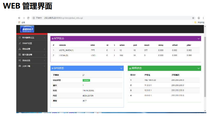 ●方便快捷、开箱即用,用于对设备进行全局监控; ●含设备运行状态:NTP状态、北斗/GPS状态、网络状态等; ●可进行SNMP设置(Trap地址等)、网络设置、NTP设置; ●可开关服务器当前运行的服务; ●可下载相关配置文件和MIB描述文件。